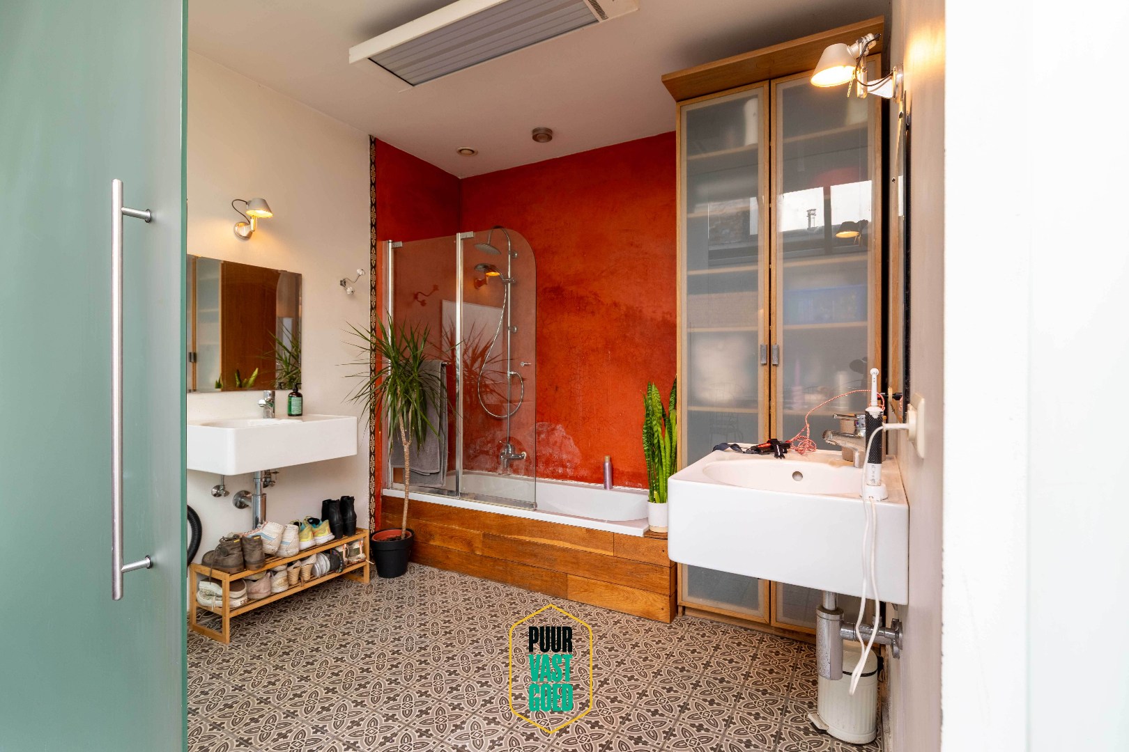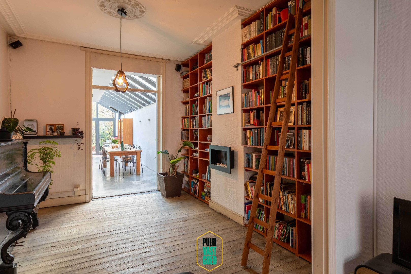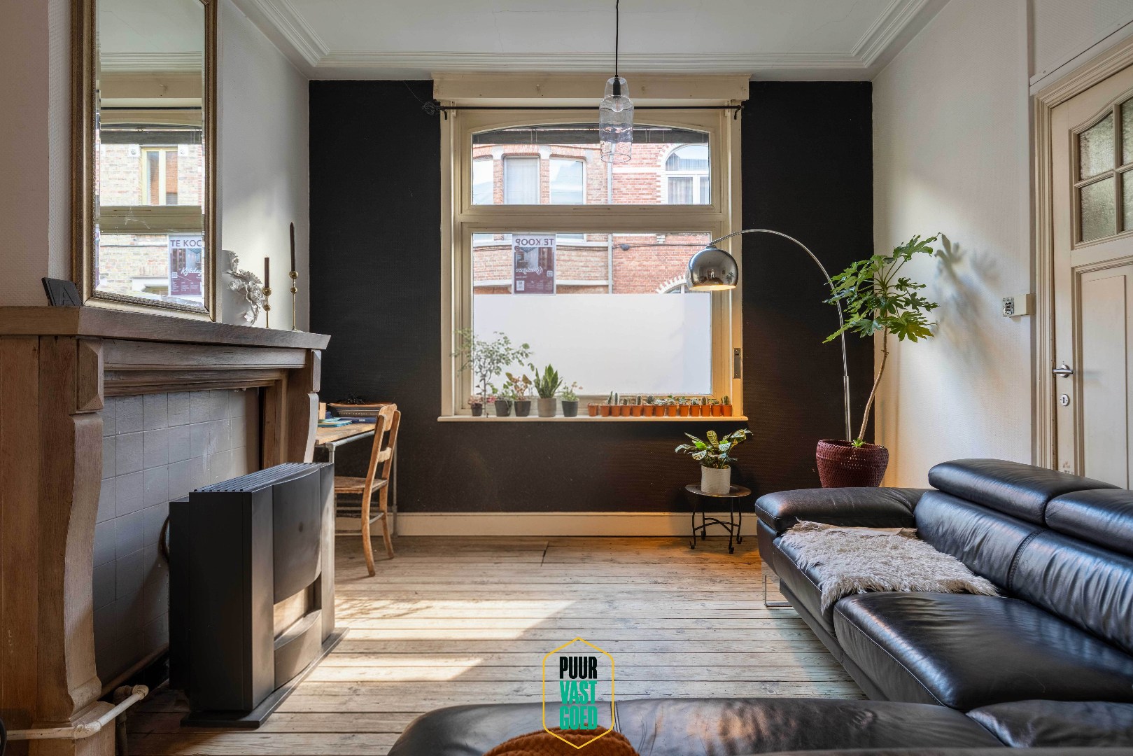 Achter de statige karaktergevel bevinden zich de cachetvolle ruimtes, met hoge plafonds en authentieke moulures. Dit is een huis waar de warme ziel en authenticiteit in bewaard is gebleven, maar vraagt toch een liefdevolle opknapbeurt. Mooie inkom-/traphal met gastentoilet. De leefruimte is voorzien van een mooie bibliotheek met gaskachel en gezellig haardje (op bio-ethanol). De in thermisch glas uitgewerkte uitbouw achteraan, deels overbouwd, biedt een mooie eetplaats annex halfopen keuken, en geeft verbinding naar een diepe tuin. Deze tuin biedt veel privacy, heeft een leuke verscheidenheid aan boomsoorten, en is op de namiddag- en avondzon gericht, achteraan voorzien van een tuinberging. In de eetplaats/keuken is het door zijn lichtinval leuk vertoeven, ook hier is een moderne gaskachel (oogt als houtkachel!) voorzien. Onder het overbouwd stuk vinden wij een geriefelijke berging, alsook een eerste badkamer. Het huis is deels onderkelderd.